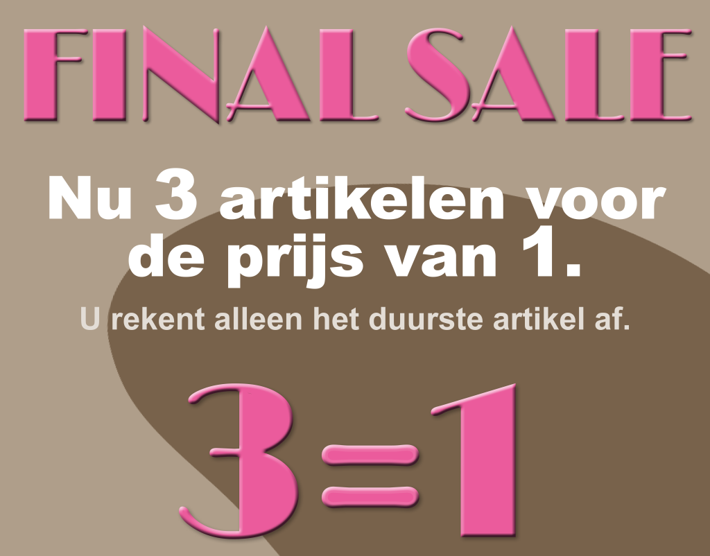 We gaan de laatste dagen in van onze sale. U kunt nu profiteren van onze 3=1 actie. 3 Artikelen voor de prijs van 1. U rekent dus alleen het duurste artikel af.