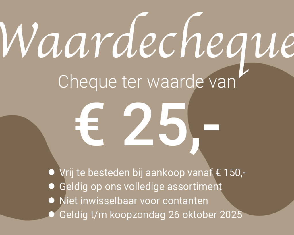 Tot en met 26 oktober 2025 krijgt u (éénmalig) € 25,- korting bij besteding vanaf € 150,-.